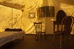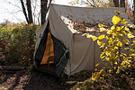 A Prospector's Tent is part of E.C Woodley's installation. This tent is on loan from THE CANADIAN OUTDOOR EQUIPMENT COMPANY