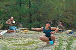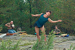 Just in front of the early autumn green and rust hues of towering spruce and fir trees, Prophet and Pomer position themselves on each side of the "stage" as the spectators admire their oddly con-founding collection of exotic, ethnic and invented instruments. The performance begins with Site and Sound a new composition created for the Tree Museum and new arrangements of Sparrow and Awakening, both original works composed by Prophet. Sound from hand-made woodwinds, glass lithophones, whirling vacuum hoses and dragged ven-tilation pipes seem as peculiarly new to the ear as Prophet and Pomer's ever-changing physical interaction with their instruments are to the eyes. When Pomer plays Prophet's Bamboo Quiver sound construction, she intertwines herself and makes the instrument one with her body. Waves of twangy warping metals, lingering cymbals, scratchy giant bean maracas and clicking bamboo head dresses flow out around the audience a naturally ambient musical air which has only just been released into the wind.