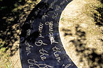 Landscape, often regarded as the materialization of memory, fixes individual and social histories in place. Lyla Rye's installation, Locus, taps into one individual's memory (a local farmer's) and personal memory (Rye's). She started out with a Juniper bush, located in a meadow that slopes down to the lake, with Jacob and Wilhelm Grimm's fairy tale "The Juniper Tree" in mind. As often happens the original idea evolved and changed. Retaining the site, with the Juniper bush, Rye eventually discarded the fairy tale, while holding on to its central theme: regeneration. One approaches Locus along a rising pathway cut through the meadow. First you see the Juniper, then the ring of black rubber, with text, which circles the Juniper. You must walk around the bush to read the text. This action is reminiscent of many sacred sites where circumambulation is part of the experience. Locus, explores, not mythical or mystical memory, but the recent history of the land: the farmer's tale (whose land is adjacent to the Tree Museum) of tent caterpillars, of frogs dying, and returning when DDT is outlawed; and Lyla's childhood memories of Muskoka. Locus is a tale/memory of continuity and discontinuity, of the renewal of the land and our role in that progress. The Juniper, one of the hardiest of trees, plays a central role in the relationship between place/landscape and memory.