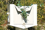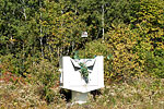 A Chirp was originally installed at Harbourfront in Toronto back in 2006. Filled with seeds and nuts for urbanized birds and squirrels, the piece was intended to be an active agent in this waterfront microenvironment of Toronto, a process that was disrupted by the City courtesy an alteration to the work that denied foraging animals' access to its interior through a small hole in the base of the piece. Relocated out here to The Tree Museum, A Chirps map/territory ratio may have been reimagined and reconfigured, but it is no less meaningful for having been so. Urbanization is, after all, not so very far away; fescue and bluegrass lawns are now an everyday part of Cottage Country as land is planted with non-indigenous flora to suit the tastes and habits of urban escapees. As a container, Harding's work even effects a possible reading as a kind of micro-sanctuary; set off the ground atop a pedestal, the inverted garden shed cradles arguably even isolates and protects a tiny little fragment of the natural world, pointedly reminding us of the truly precarious condition of things, and that human intervention doesn't necessarily have to be to the detriment of the living world"