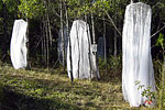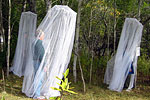Nets hang from trees along a pathway. Visitors are invited to stand and listen from inside. The net designates a space for concentrated time. Standing with Trees explores the relative nature of time. Dedicated to Richard Pochinko who "stood for days and thought it was hours."