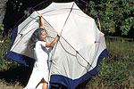 A woman dances by a lake with a tent for a partner. Visitors are invited to watch and listen from outside. The tent is a metaphor for the body and the illusion of permanence. Tent Dance addresses the ever-changing nature of reality. Dedicated to Gertrude Karnow who wanted to "see beyond the veil".