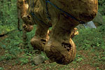 "In the clearing that the horizontal trunk spans, the figures hang and gently sway in the breeze or when caused to do so by visitors (human or animal). Larmand has stated that the inspiration for Butoh comes from the Sankai Juku Dance Troupe, a Japanese-based group best known for their balletic performances done while being lowered from the sides of buildings (which resulted, years ago, in the death of one of the dancers), so theatre, drama, and the idea of the stage are integral to the work. But metaphors proliferate in this altered stand of maples, one of which has everything to do with the idea of home. What we essentially have, here, is a kind of sketch or outline for the concept of a home (stay with me, now). The long horizontal timber spanning the clearing is arguably analogous to a long central ridge poll of a roof held in place by supporting columns (the standing maples on either side). The roof itself could be likened to the canopy of trees overhead. If we push the analogy to a possible conclusion, the figures hanging suspended in the clearing could be likened to, say, a household finding shelter from the elements, bound together by the meaning of "home". In Larmand's piece, the tree trunk spanning the clearing and holding the figures suspended above the ground is bowed in the middle by their weight. If we tweak our analogy, perhaps this expression of gravity might be representative of the emotional and psychological weight of the sheltered inhabitants straining things to the point of some kind of possible (or even eventual) collapse. Butoh does, after all, have an air of impermanence to it: the ridgepole is tied off with rope at either end (and not permanently fastened), and the figures are likewise simply roped into position. Entropy and decay will eventually have their inevitable way. As with everything, this world too will collapse. "Life is a bridge," the saying goes. "Build no house upon it." But we do, and it does. Always".