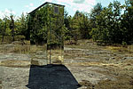 Inspired by a dilapidated wooden latrine, John Dickson rebuilt the outhouse featuring an exterior composed entirely of mirrors. From a distance, the mirrors effectively warped the vista of rock, trees and sky around the structure, perceptually blending into the surrounding landscape. The effect was hypnotic. the artist transformed the vernacular form of the outhouse into an aesthetic isolation chamber that contrasted outdoors and indoors, natural and artificial, day and night.