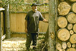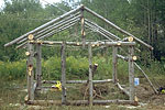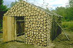 Shed sets up what initially seems to be a classic confrontation between nature and artifice by using two fundamental and easily recognizable symbols: a house and a tree. The house is an archetypical dwelling, about 12 feet wide, 14 feet long and 10 feet high at its peak, with a frame fashioned from slim poplar logs extracted from the immediate area, and using old barn board for the roof and walls. The entire exterior of this rustic shelter is covered with hundreds of small discs, also cut from poplar logs, an element that is by now somewhat of a trademark for the artist.