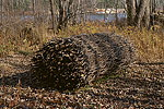 ...."Nestled in a forest clearing, Robert Wiens' installation Log II reads initially as a fallen tree, its shape and size mirroring those flanking it in this grove. Closer examination reveals a composite structure. Single branches gathered from the immediate site are trimmed and tightly intertwined. Bundled together, the branches create the illusion of a solid trunk. Different trees and different woods are used, yet the colour is uniform. The surface texture, which mimics bark, is produced from the action of weaving the twigs. Rather than an accumulation of rings enumerating its age, the exposed ends of the 'log' reflect various diameters. Figure and ground are close, yet the artwork maintains an internal coherence as a sculptural piece; at the time of completion, the boundary between the work as a positive form and the forest floor is respected.