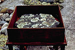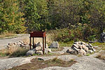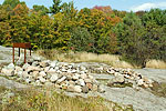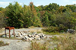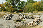Mining the repositories of memory, Anne O'Callaghan reconstructs the natural and human histories issuing from this site. In Relic of Memory, domestic and architectural structures fabricated from contemporary industrial materials are introduced into the environment. An eight-foot long steel table squarely placed in a moss-laden clearing bears the inscription "Huron Hatherly Ruttan," identifying the generations of people who have inhabited this territory. Alternately, the poetic insertions on the reverse trace the organic constituents of the earth: "Petrified Wood.Dead Lava.. Cooling Star..Incarcerated Ghosts" extending the historical continuum. (See 1998). …a steel vitrine is positioned at the apex of a sequence of stone markets. Referencing museological systems of categorizations. O’Callaghan recontextualizes and codifies the natural artifacts of the immediate locale: rock, moss, lichen. Reminiscent of cairns, the piled stones at its base evoke historical antecedents: the demarcation of burial sites, or signposts on a journey. However, their apparent randomness implies a more natural occurrence. Remnants of a one hundred year old wall, these stones are employed as a tectonic vocabulary through which natural and human boundaries are redrawn. Meandering across the coarse surface of the shield, the stones, in fact emulate the gravitational flow of water, inverting the re-ordering of nature within cultural categories.
