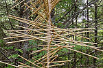 A Gathering of Quivers is a site specific installation of bamboo and copper quivers suspended vertically among trees, horizontally between trees, stretched on top of and suspended over large rocks and lichen beds. The primary intention is create a group of shape changing objects that blend into the surroundings in a way that implies a historical presence in the environment. when visiting the site these are works that you need to look for as they blend into the landscape.