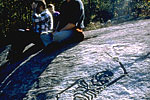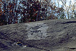 The materiality of Tim Whiten's composite piece is reduced to the essential element of his chosen site: the Pre-Cambrian shield. Danse includes two skeletal figures sand-blasted into the rock. Rendered on the slope of a hill, the first figure is dark and visible from a distance, beckoning us towards the second which lies on higher ground. The joints of these life-sized images are deftly articulated, while the veins of the granite crisscross within the etched boundaries of the bones, enhancing the gestural vitality of the figures. Exuding a kind of mischievous jubilance, both characters don instruments: one beats a drum slung around his hip; the other plays a xylophone strapped around his neck. Coupled with the depiction of an hourglass, the refrains of mortality reverberate: the rhythms of life coalesce with "the dance of death." While echoing traces from prehistoric rituals, Whiten's imprints on the landscape are reminiscent of fossilized forms embedded in the earth's surface. The temporality and brevity of human life merges with the imperceptible movements of geological time. As "bones of the earth," the rocks remain both host and witness to the endless processes of regeneration.