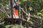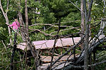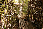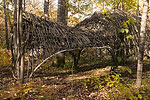 The largest piece is Wang's Bridge, wherein trees become a living loom through which branches and limbs of resident scrub brush are secured using pliable rattan. It is an enclosure, a contemplative space, a space in transition, a channel from earth to sky to water. To engage with the work is to enter a space, to travel across and through, emerging at one end deeper in the forest and at the other, aloft amidst the tree canopy and overlooking the lake.