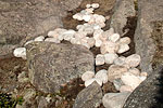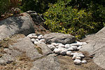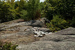 To a Canadian audience, questions of identity, nationalism, power and authority are immediately readable in Belmore's displaced stones, as representation at a basic level for the cultural displacements experienced by First Nations people. The piece is a quiet whisper, a soft chuckle, a sly dig. Belmore carefully plots the ideal location, sculpts white stones into a subtle pattern, and transports them to their final placement through the woods, up and down several rocky prominences to a crevice on a the perfect chunk of Canadian Shield. Viewers must make a commitment, leave the main path and follow a marked trail deep into the woods. The approach to the actual installation is a final climb to a rocky promontory...